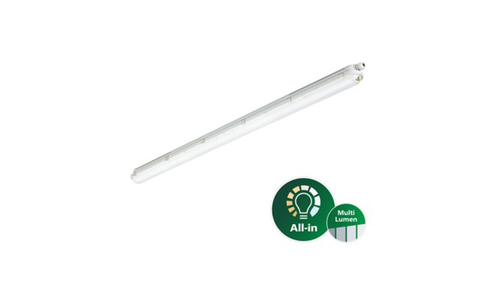 L1500 mm, Polycarbonate, Grey, Power supply unit (On/Off), All-in, Multi Lumen, 3300 lm, 4100 lm, 4800 lm, 5800 lm, 37.5 W, 21.5 W, 150 lm/W, 155 lm/W, 4000 K, (0.38, 0.37) SDCM<3, Symmetrical, Clear, Polycarbonate, IP66 | Dust penetration-protected, jet-proof, IK08 | 6 J, Safety class I, Push-in connector 5-pole, Emergency lighting ready (through compatible battery kit accessory)